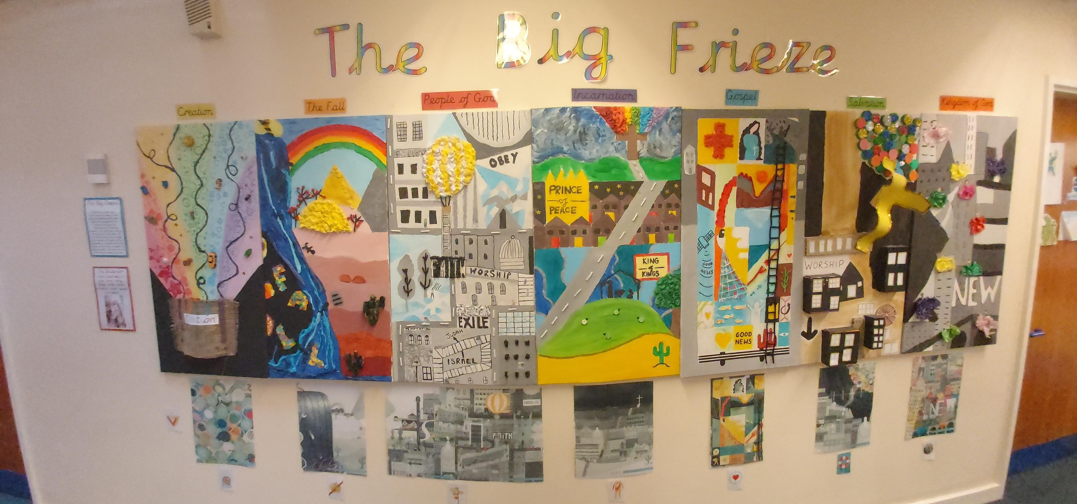 At Herne CE Infant and Nursery school we use the ‘Understanding Christianity’ syllabus for weekly RE lessons for our Christianity units. We think about the bible as the big story of God and use ‘The Big Frieze’ to help us understand each part. Each term we have a ‘big question’ which we seek to answer together.