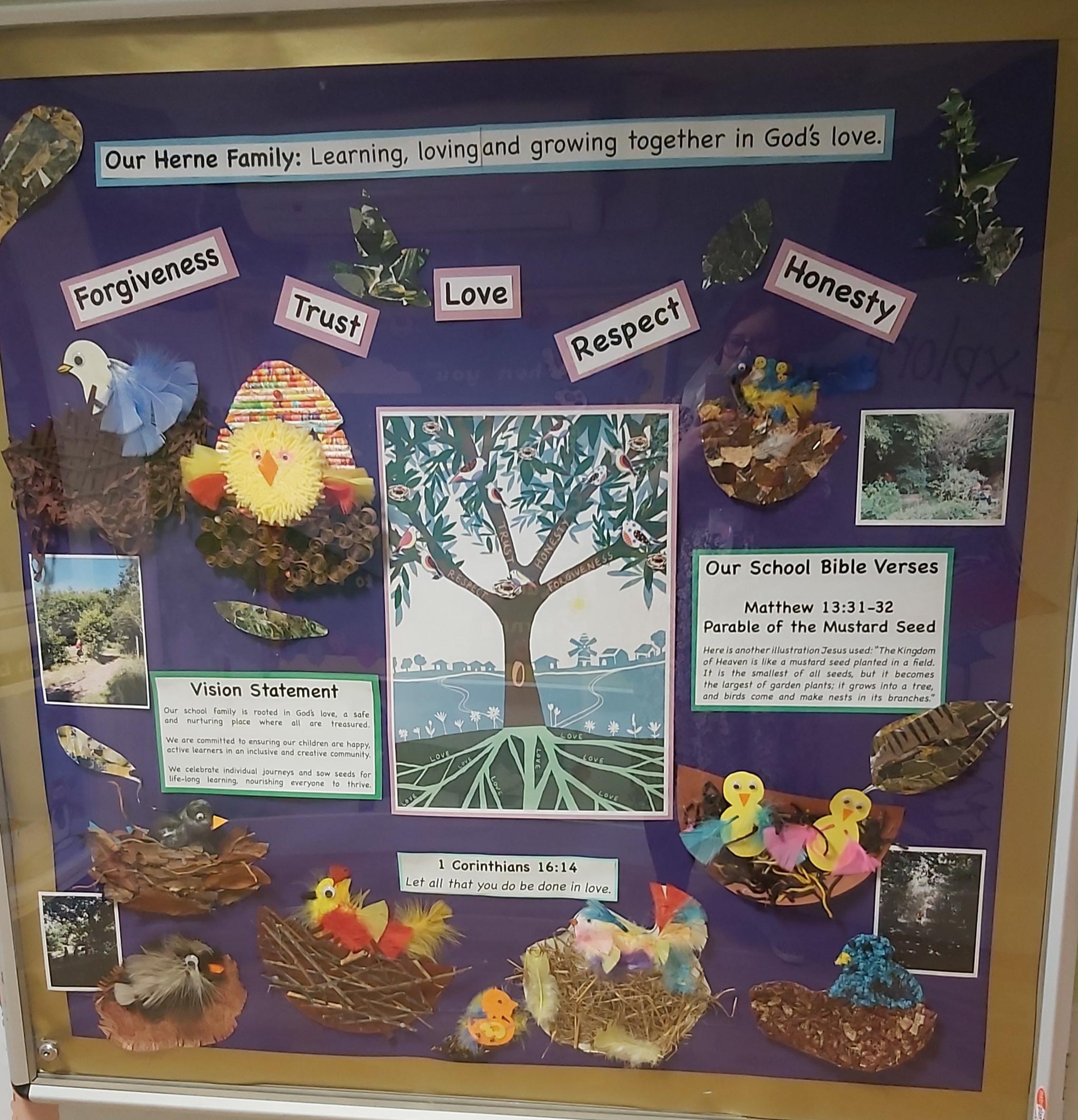 We see our whole school community as tiny mustard seeds that are planted in good soil and nurtured, which will in turn grow into their own trees, displaying our school values. Our prayer is that the branches of those trees will in turn become safe spaces to offer support to others who need it. We are also planting tiny mustard seeds of faith into our school community, helping all to ask questions and make sense of the changing world around them.