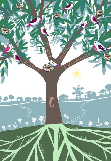 Our school is a safe and nurturing place, like a well-established tree, the largest of all garden plants. Our artwork shows love is in our roots and that as our tree grows, our other school values of forgiveness, honesty, trust and respect develop and flourish too. Our community feels safe and welcome to come and make a nest in our branches, receiving the love, care and support they need.