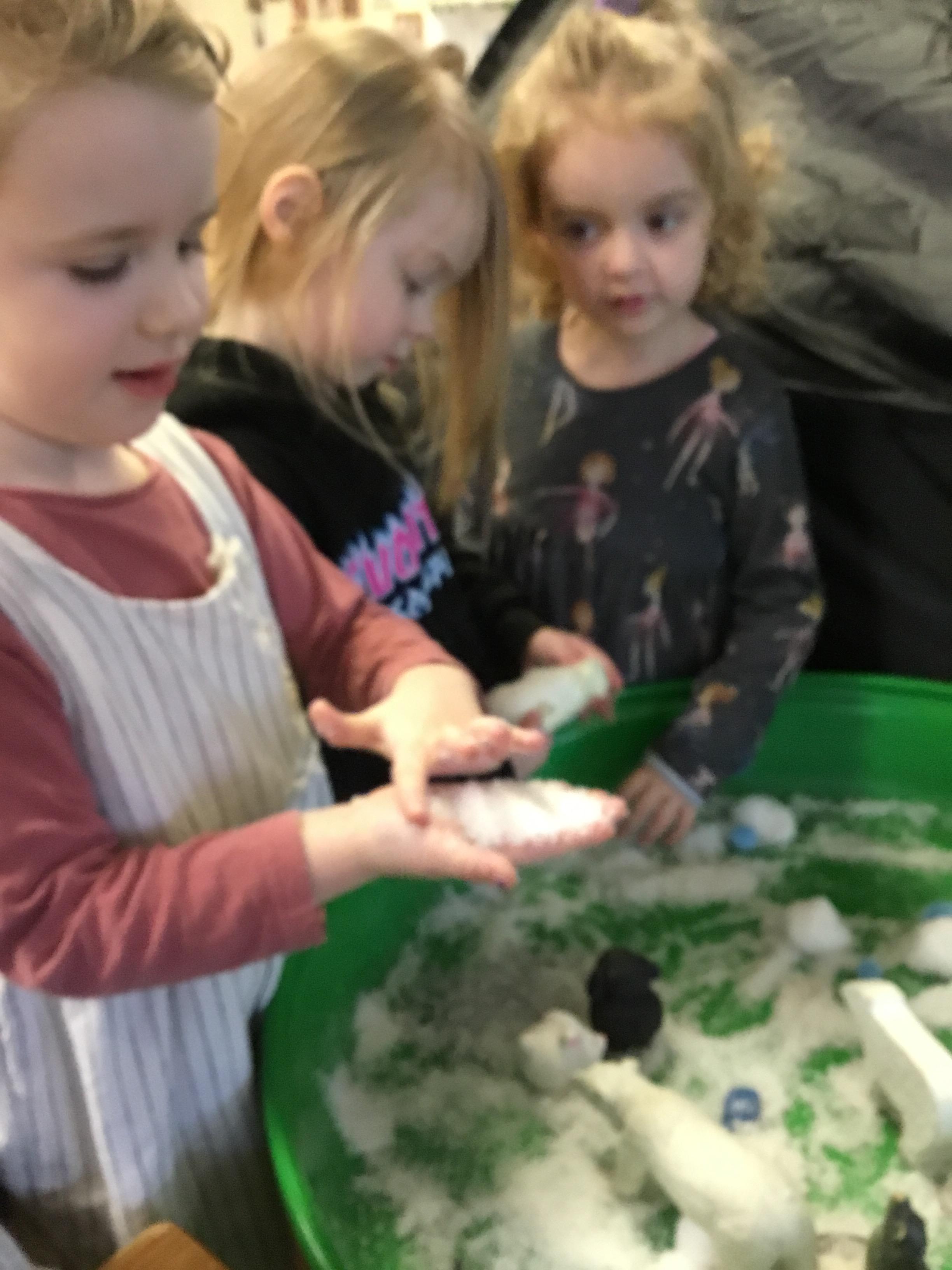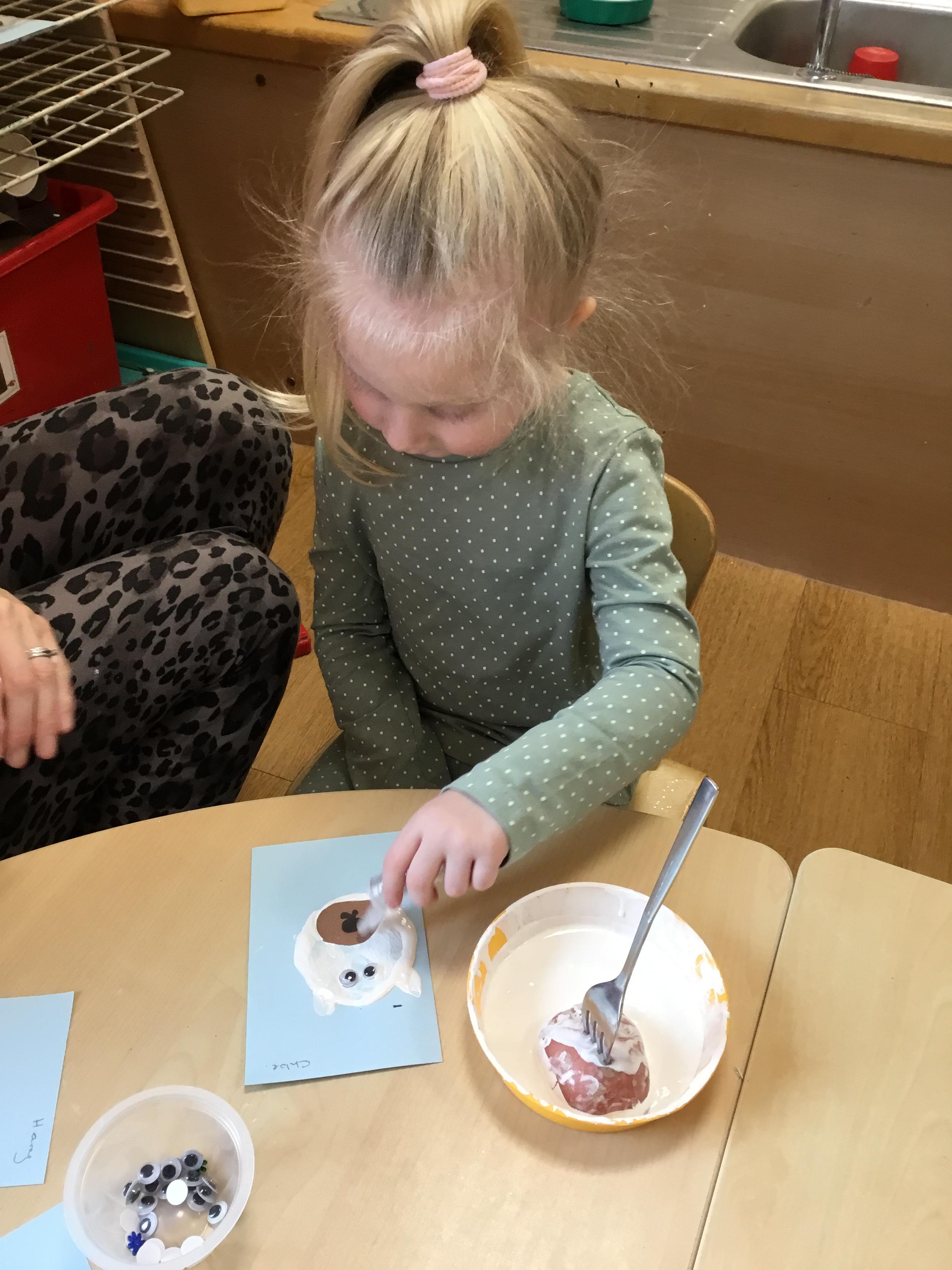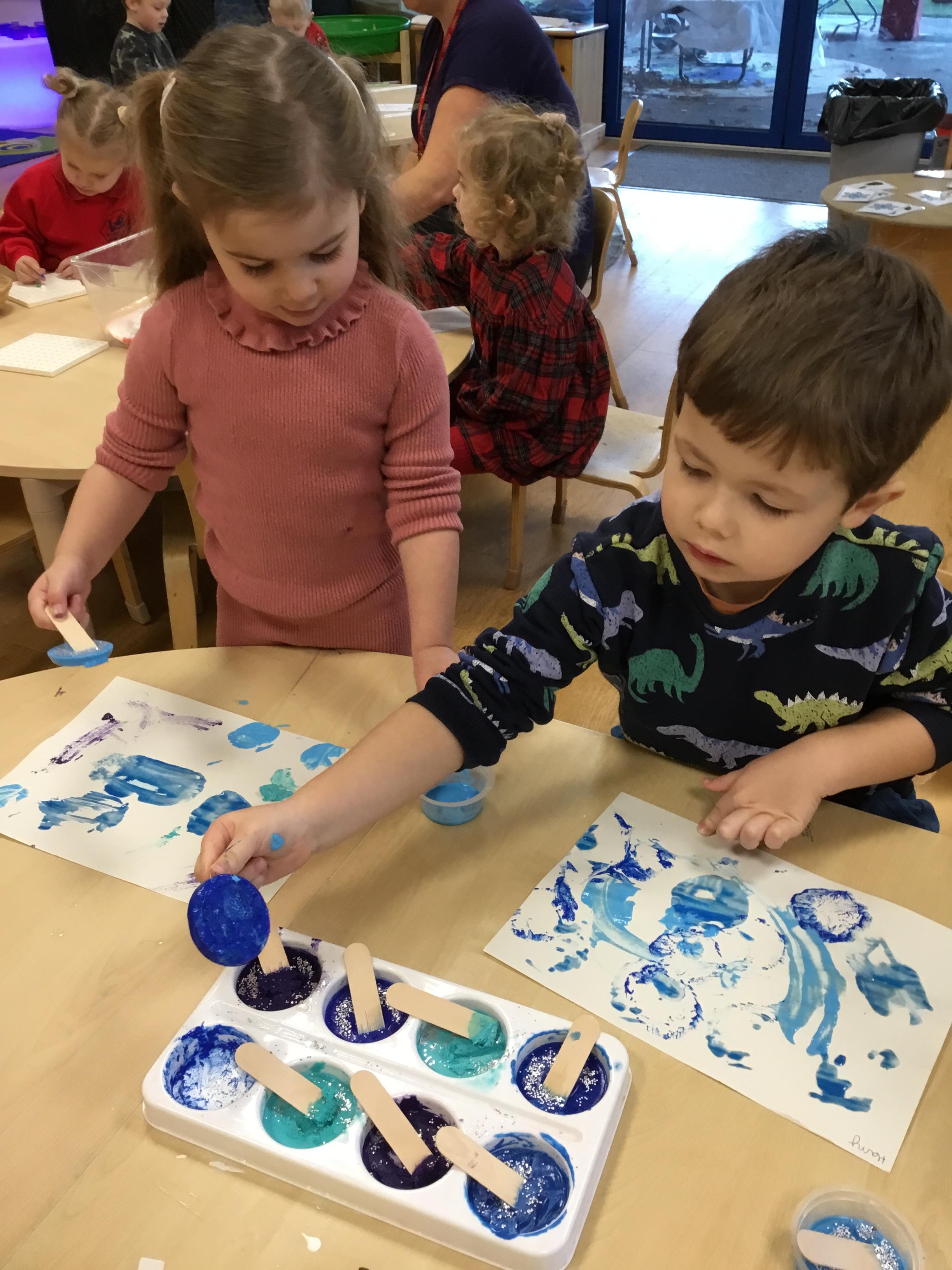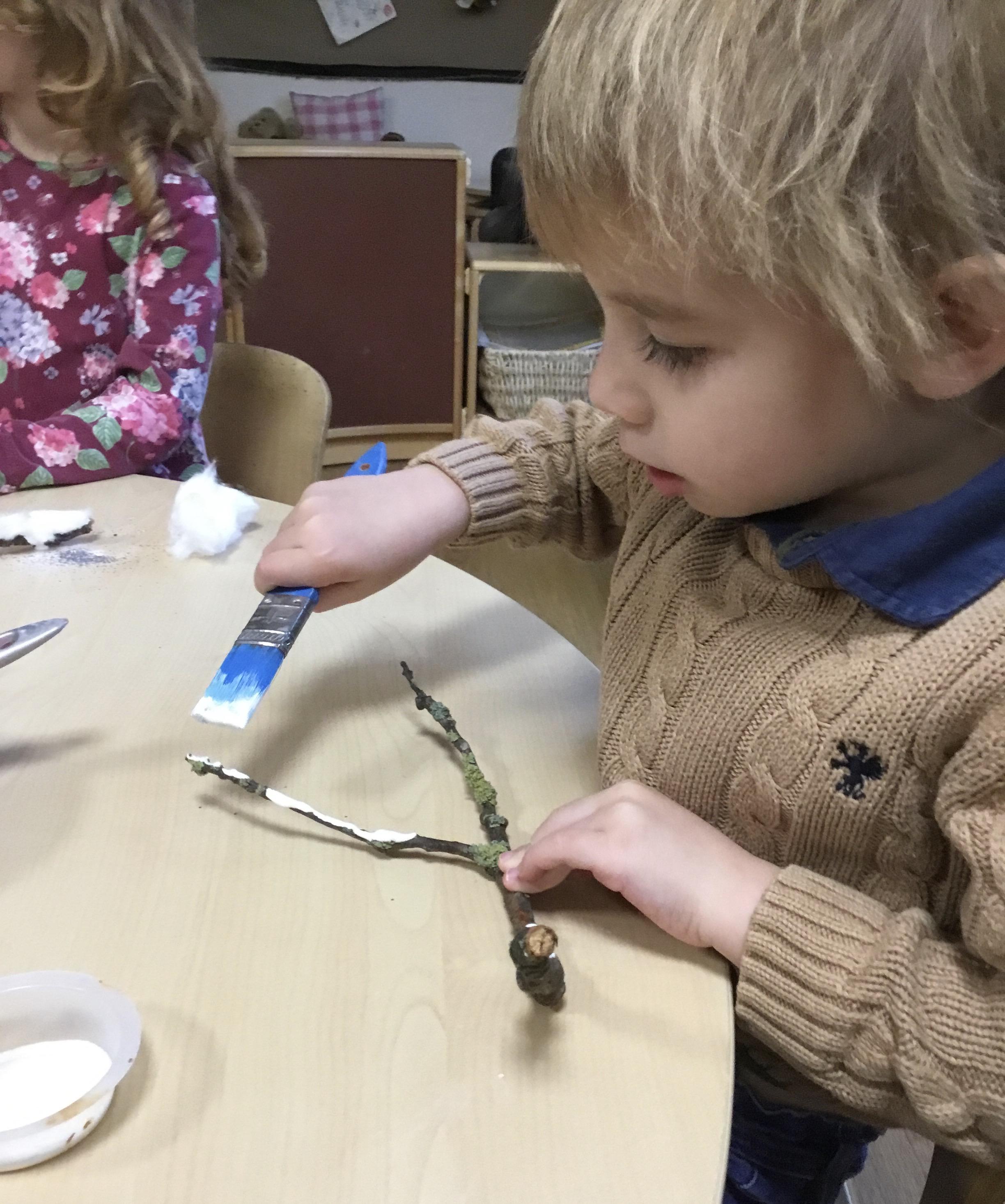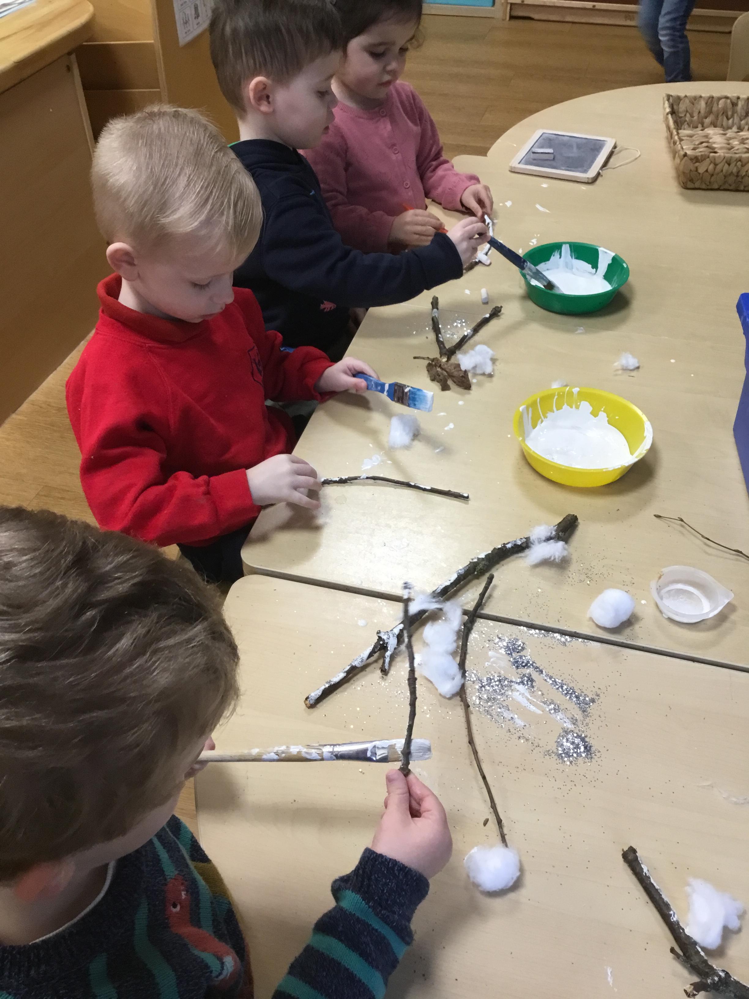 After Christmas, we found another use for our leftover pumpkins – turning them into birdfeeders and snowmen (after we’d painted them white first of course!) We also used our creative skills to decorate mittens, our maths skills to make repeating patterns on scarves and our language skills to retell the story of The Snowman. As well as this classic story, we also enjoyed lots of other winter themed stories. We explored ice and discovered what causes it to melt as well as experimenting with ice paints. We observed frost and recreated it on bare sticks using cotton wool and glitter. Winter isn’t dark and gloomy – it’s FUN!