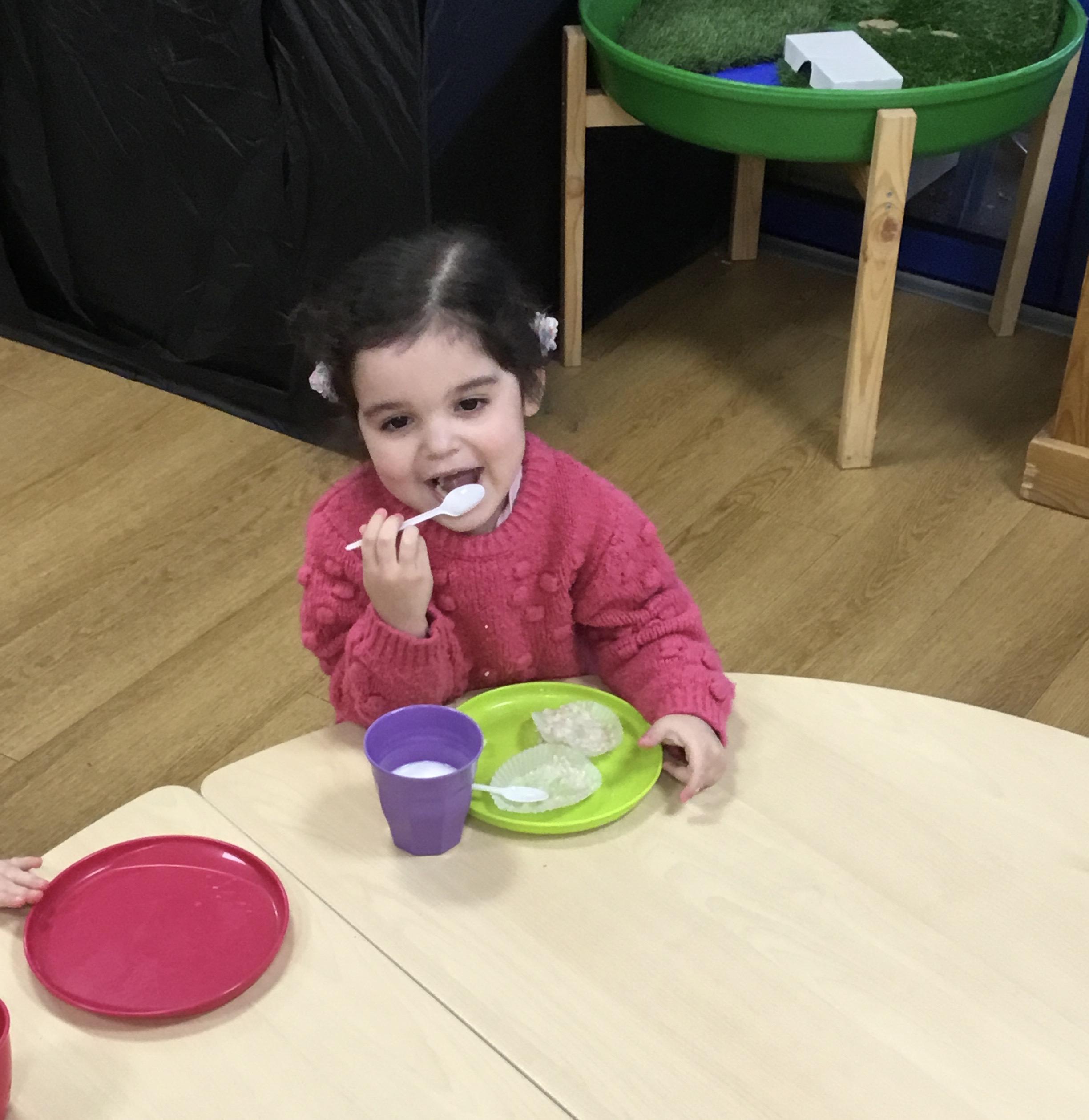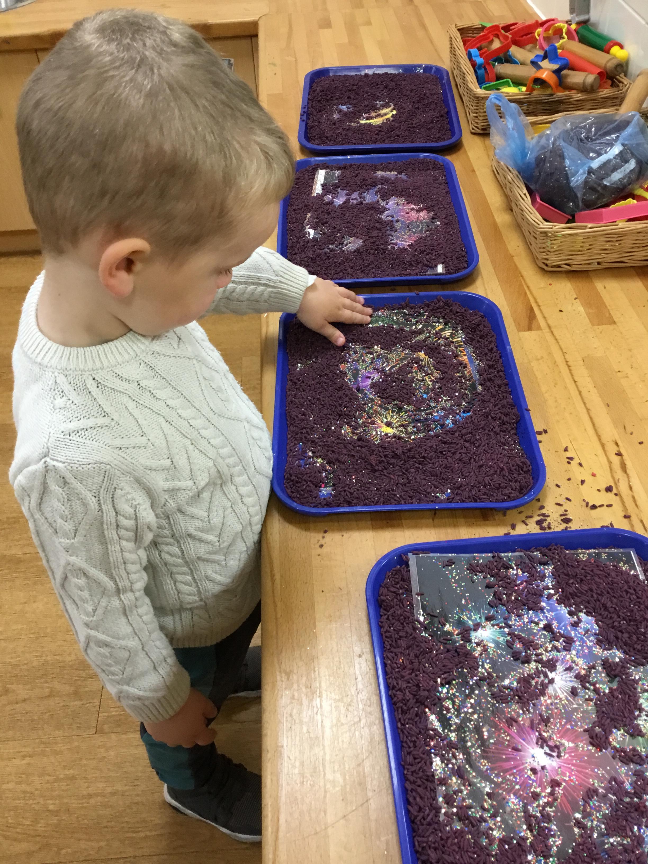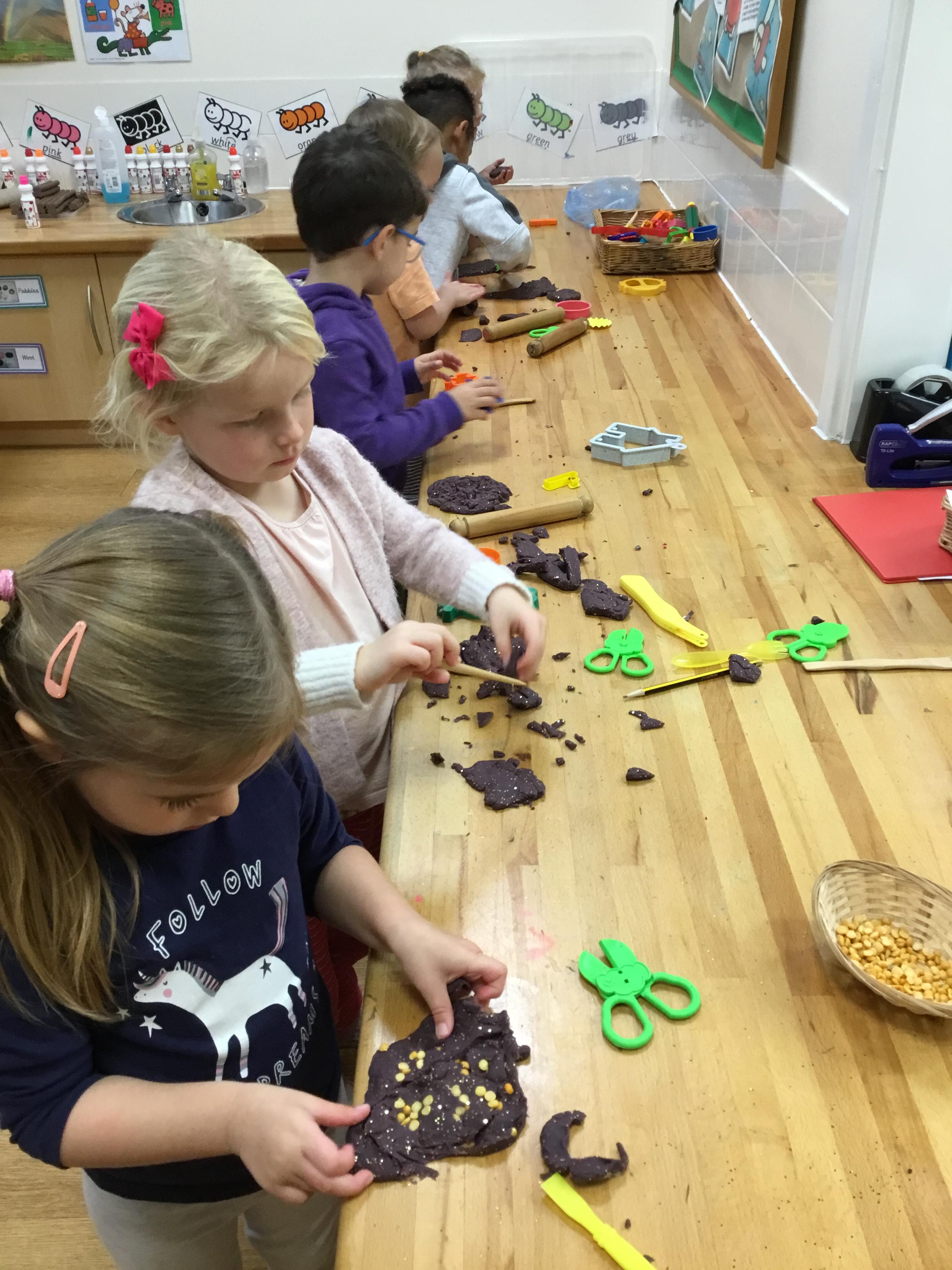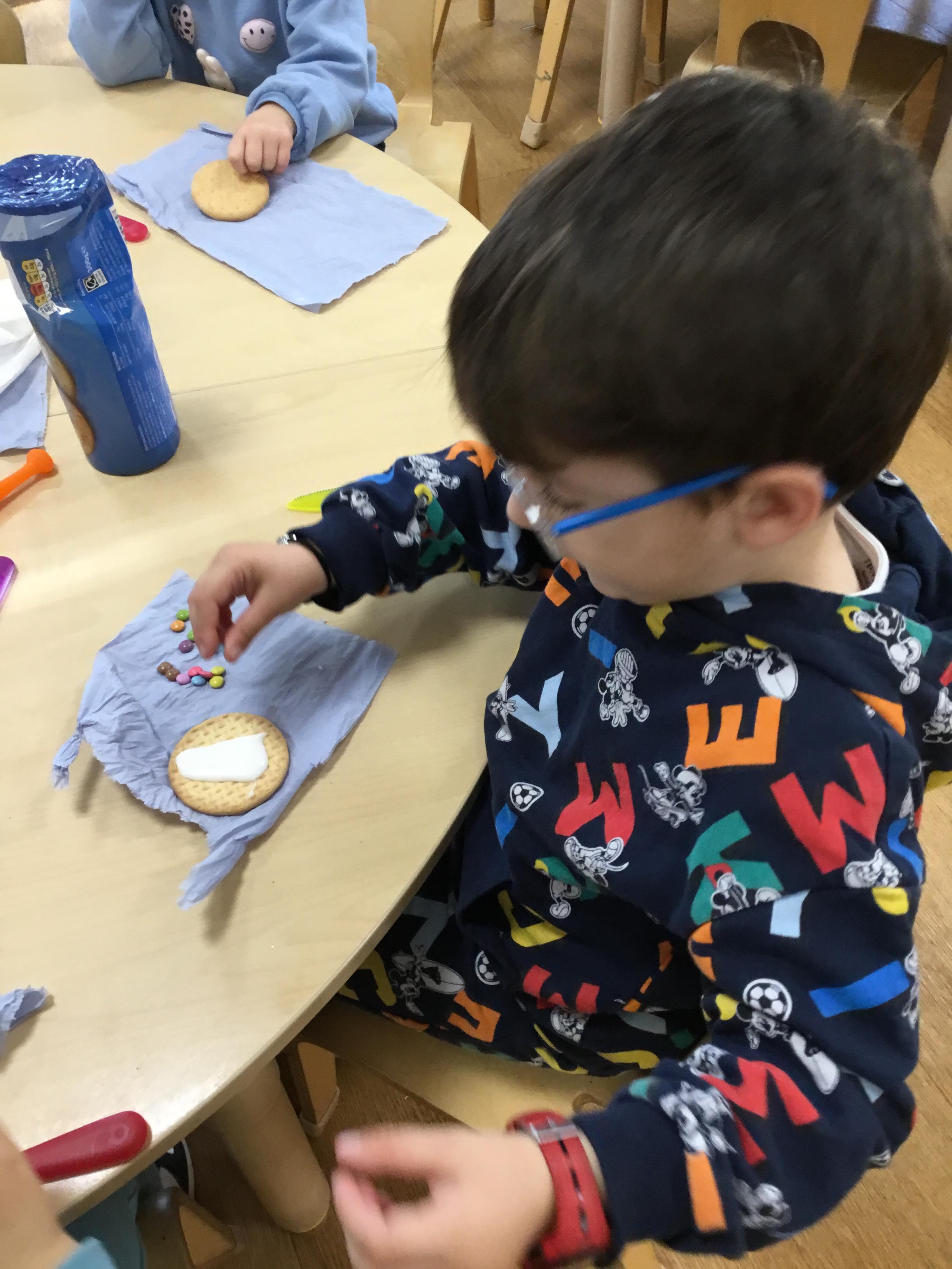 Finally, we have explored the theme of Rain. We learned some rain rhymes and accompanied them using instruments and we have found out a little of how rain is formed – we even did an experiment to see what happens when a cloud gets too full and heavy! We counted and matched raindrops and designed our own. We even did an Incy Wincy Spider dough disco to strengthen the muscles in our hands and we loved mark making in a cloud (of shaving foam!)