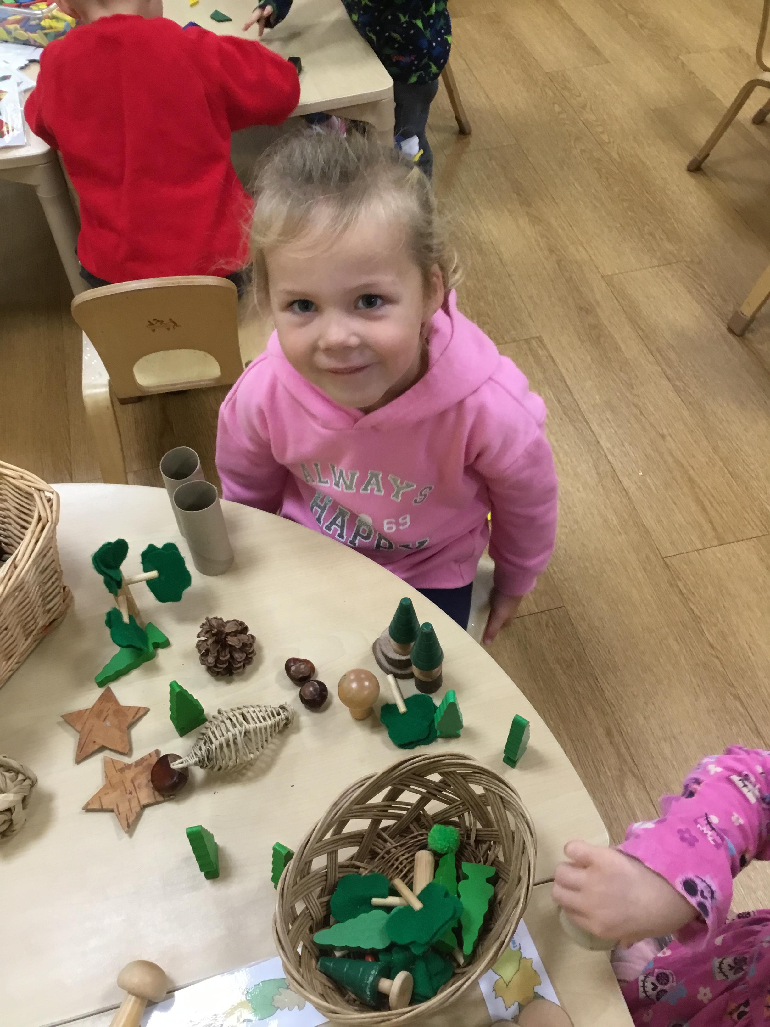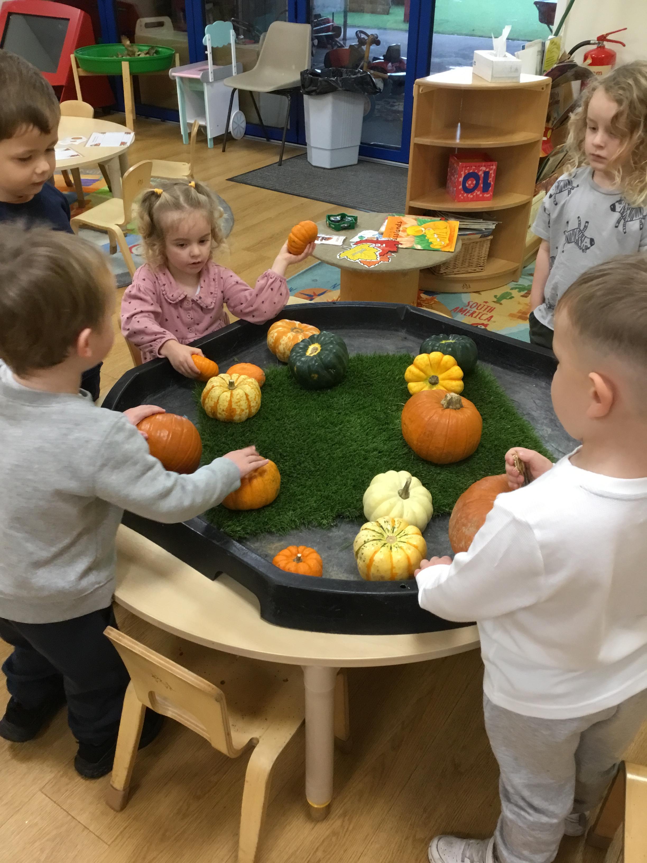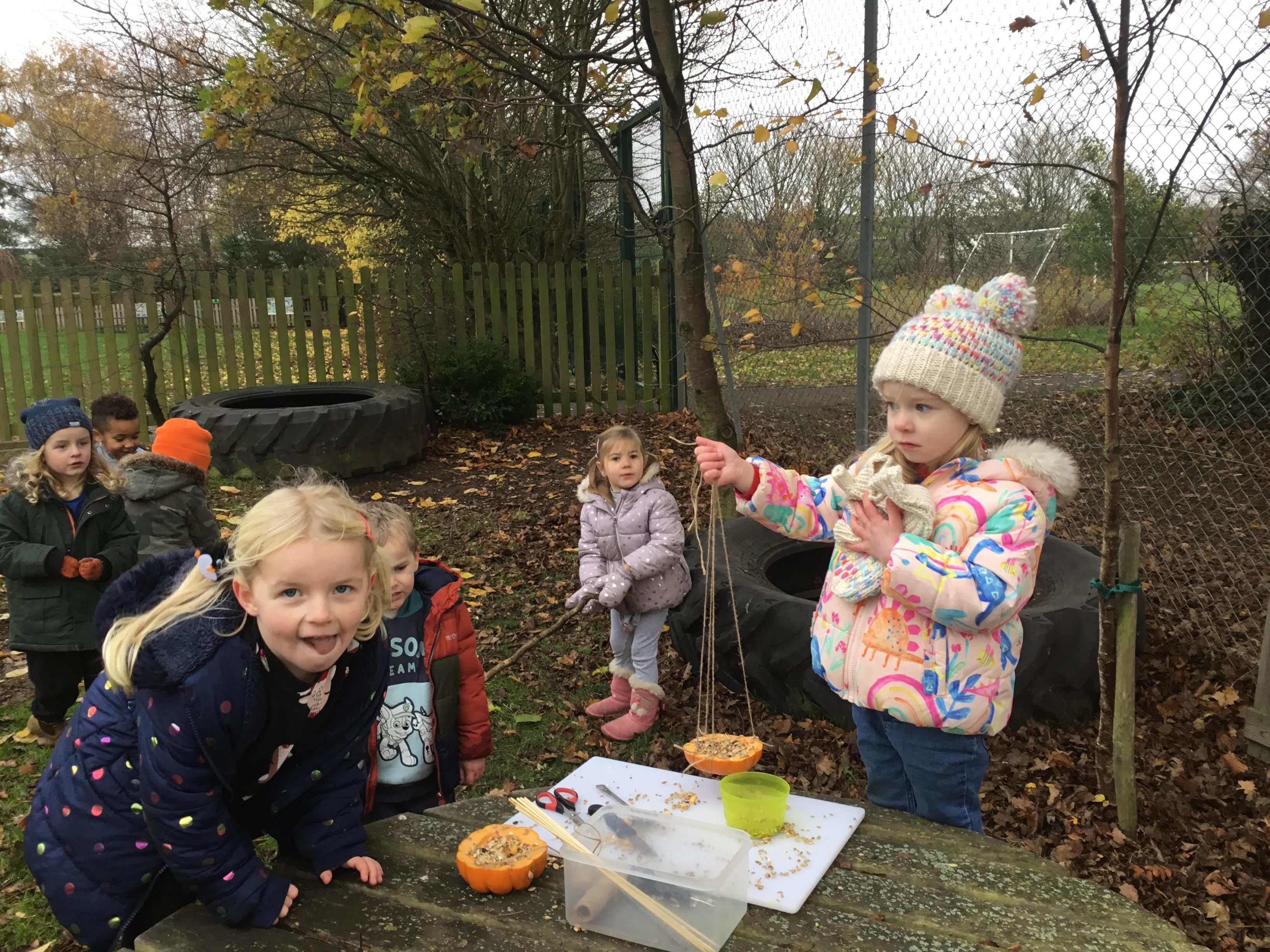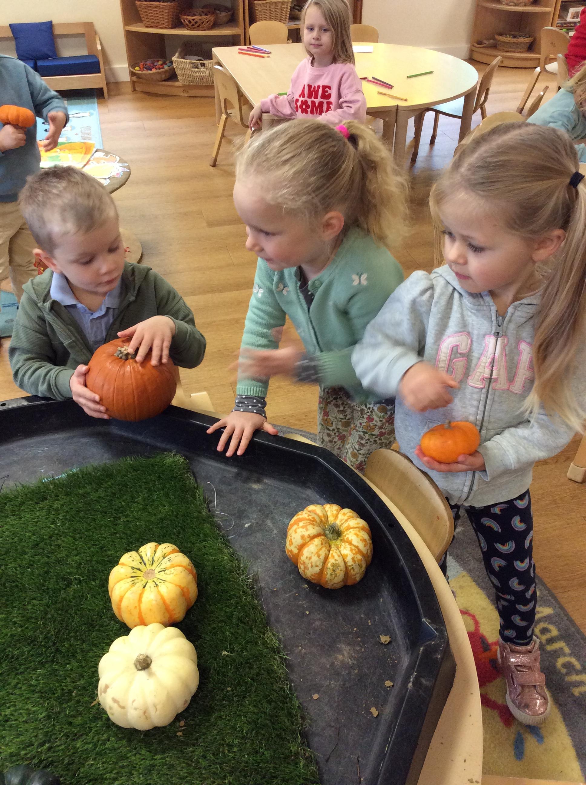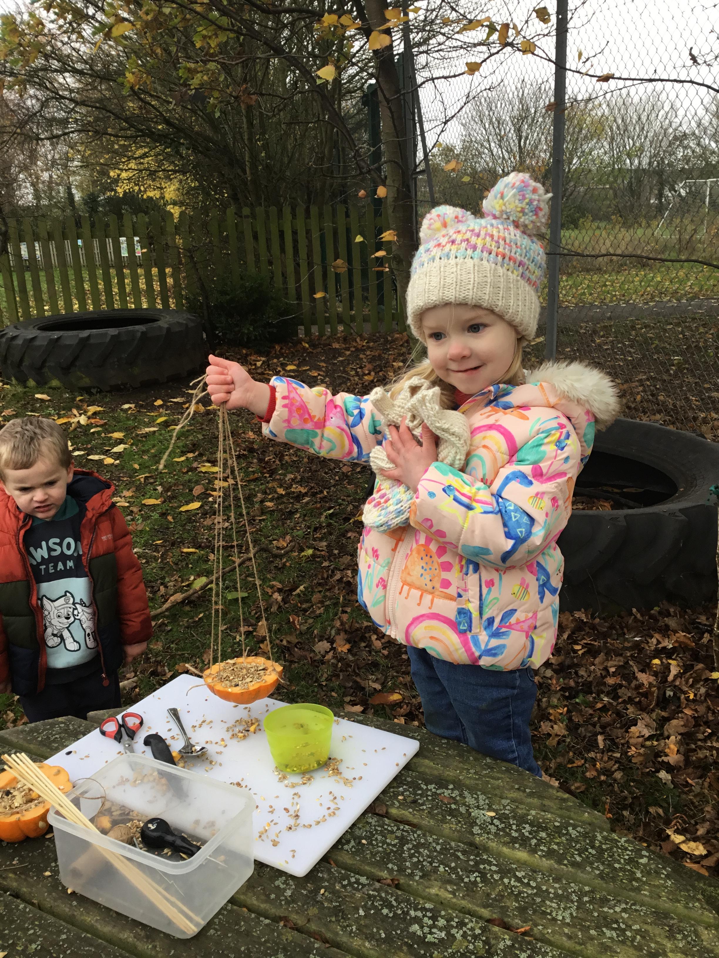 Autumn arrived in earnest and that lent itself to another well loved theme – Autumn. We enjoyed listening to lots of Autumn themed stories including Leaf Man by Lois Ehlhart and we collected different coloured and sized leaves to make our own leaf people. The children really liked playing with pumpkins – sorting and ordering them by size and colour. We have saved some to paint white in winter and the rest we made into bird feeders