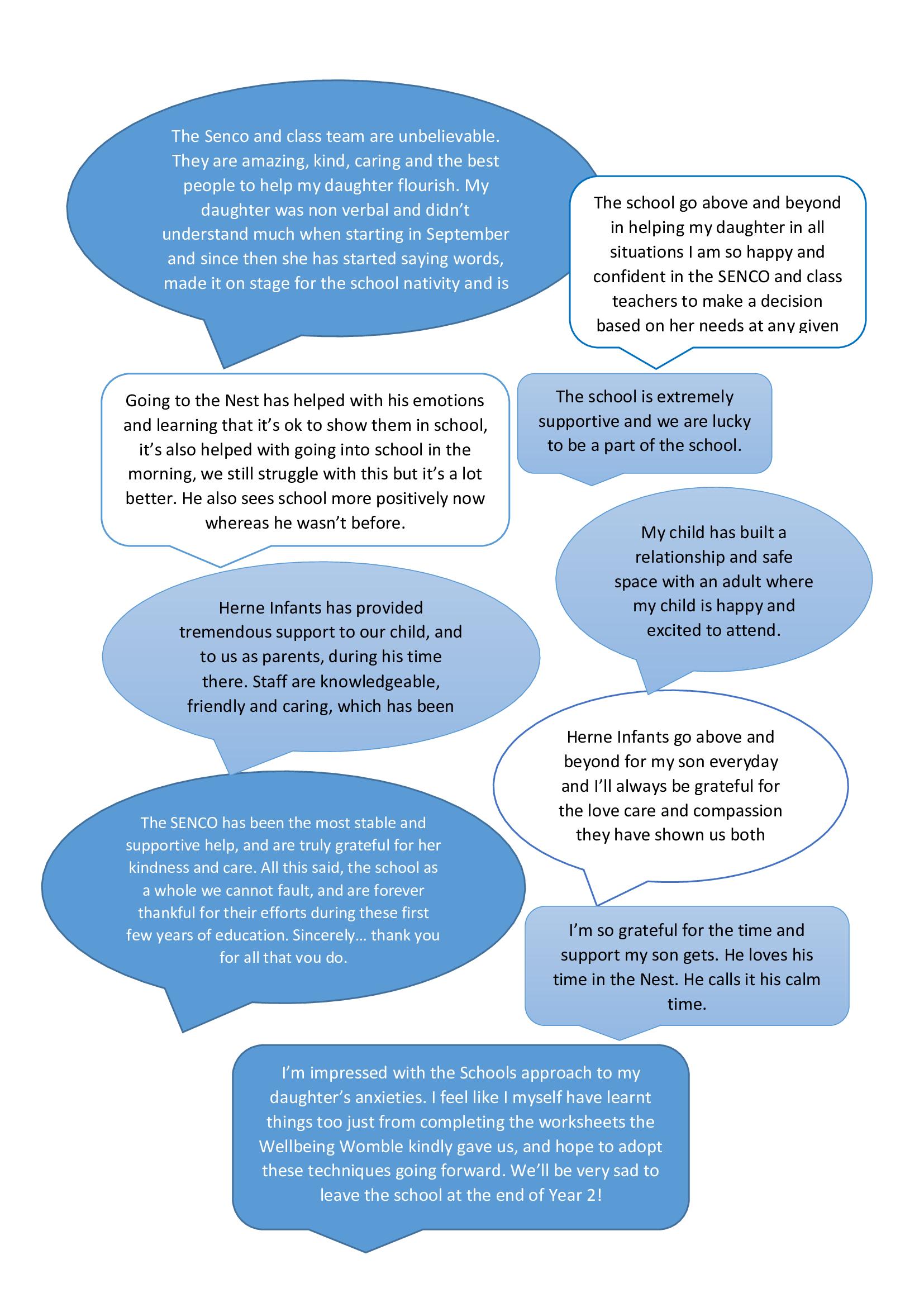At Herne CE Infant and Nursery School, we invest in the wellbeing of all. By a “whole school approach”, we mean involving every individual in the school community: pupils, parents and all staff and volunteers. Everyone has the chance to understand and implement practical things which will contribute to changes in practice and benefit all the students in the school. Wellbeing is a priority for all staff and we aim to ensure that our children and families feel safe secure and valued as part of the school and wider community. Children need to be happy, confident and settled in order for their brains to be able to function and for them to be able to access learning. Most importantly all children have the right to feel valued and loved. Without this children will fail to thrive and reach their full potential. As a school we want every child to believe that they are able to achieve anything as they develop essential life skills such as perseverance, resilience and problem solving skills.